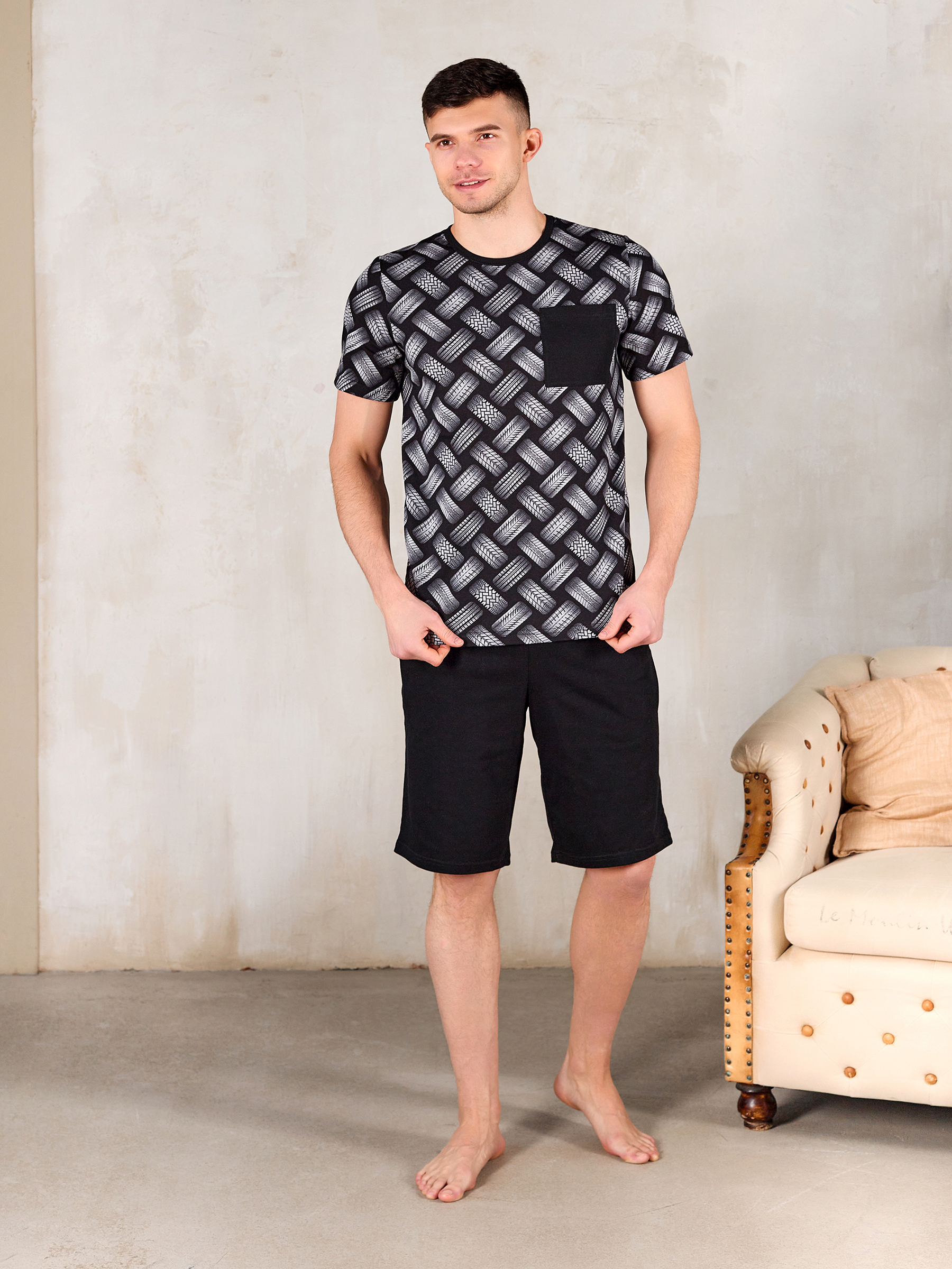 Покрой изделия обеспечивает свободу движения и подойдет на любую фигуру, а благодаря натуральному хлопковому материалу костюм для дома мужской с принтом прекрасно пропускает воздух и очень приятен к телу, что и нужно для домашней одежды.